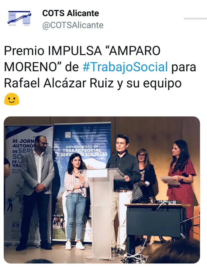 El jurado de la convocatoria 2018 al IV PREMIO TS IMPULSA "AMPARO MORENO", de los Colegios Oficiales de Trabajo Social de Alicante, Valencia y Castellón, otorgaron por unanimidad el premio al proyecto presentado conjuntamente por dos de nuestros socios, Rafael Alcazar y Eva Pérez, junto a dos alumnas de Grado de Trabajo Social de la Universidad de Alicante, Victoria Fernández y Paula García.