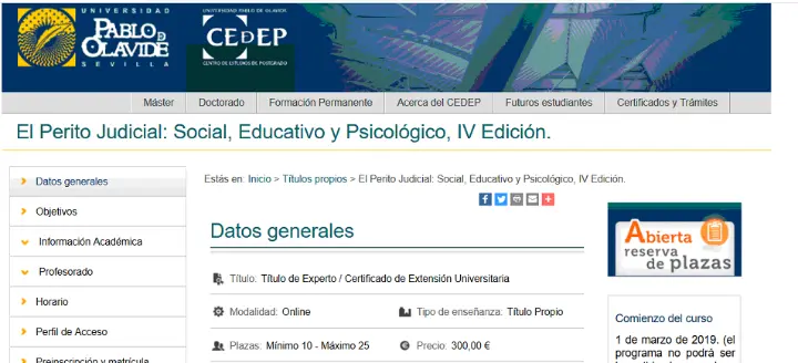 Junto al Máster en Trabajo Social de la Administración de Justicia, título propio de la Universidad Rey Juan Carlos de Madrid de 60 créditos ECTS, cuyo plazo de matrícula se iniciará a partir del día 1 del mes de septiembre y finalizará el día 20 del mismo mes, la Universidad de Pablo Olavide de Sevilla oferta el Título de Experto "El Dictamen Pericial, el Informe Social y la Entrevista: aplicación de instrumentos y técnicas de investigación para la elaboración de un documento procesal", que tiene como objetivo primordial formar a profesionales del Trabajo Social para que ejerzan su actividad como peritos sociales forenses.